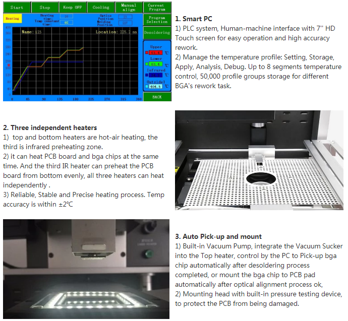 יכול לעבוד מחדש BGA, PGA, POP,BQFP, QFN, SOT- 223, PLCC, TQFP, TDFN, TSOP, PBGA, CPGA, שבב LED.
